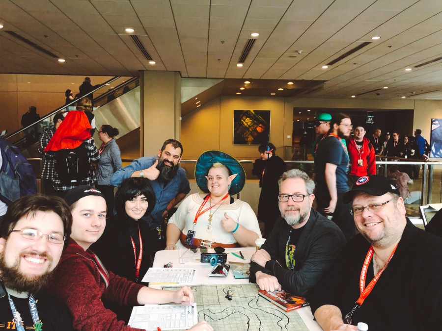 The weekend, however, was not lost. A friend of mine had invited me to a Facebook group of local RPGers (Role Playing Gamers), mostly folks who played D&D (Dungeons & Dragons). While I hadn’t yet played a game with anyone, I’d interacted with a DM (Dungeon Master) who told me he was hosting an intro D&D game at the convention. I’d missed the first two days doing other events, but the last game he was hosting was Sunday morning, as soon as the doors opened. Rallying the last shreds of my dignity, I put on one last costume and got my butt downtown fifteen minutes before the doors opened, knowing if I showed up late to the table, I’d never have the courage to introduce myself to a group of complete strangers.