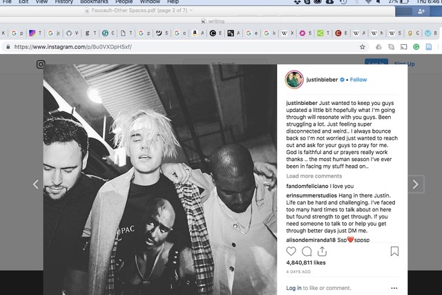 How do we even begin to ask for help these days? Justin Bieber posts on Instagram that he is struggling and needs help. I see it through a screen. Touching only machine my finger touches his face. Does he get help? Does he feel better? 4,840,811 people like his photo. Maybe that helps. I touch the machine again. He might already be feeling better. The trace of a trace. I scroll onward and he goes back to pushing his own boulder—uphill uphill uphill then down down down.