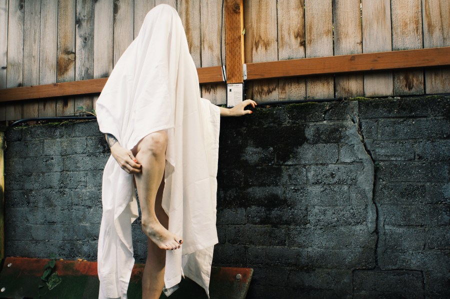 Now, at 5:23 a.m., jittered awake, I retool the argument for the paper I have to present in a handful of hours—to try to philosophically position the ghost as what drapes over the otherness of chaos within the self, the sheet of death draped over our not-quite-humanness. We are E.T., living lives as a faulty payment on the debt to time, awaiting a certain loss which welcomes us into mourning, carving us out into empty spaces which double us over in pain.